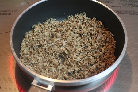 3)フライパンに広げて入れ、弱火にかけて水分をしっかりと飛ばす。