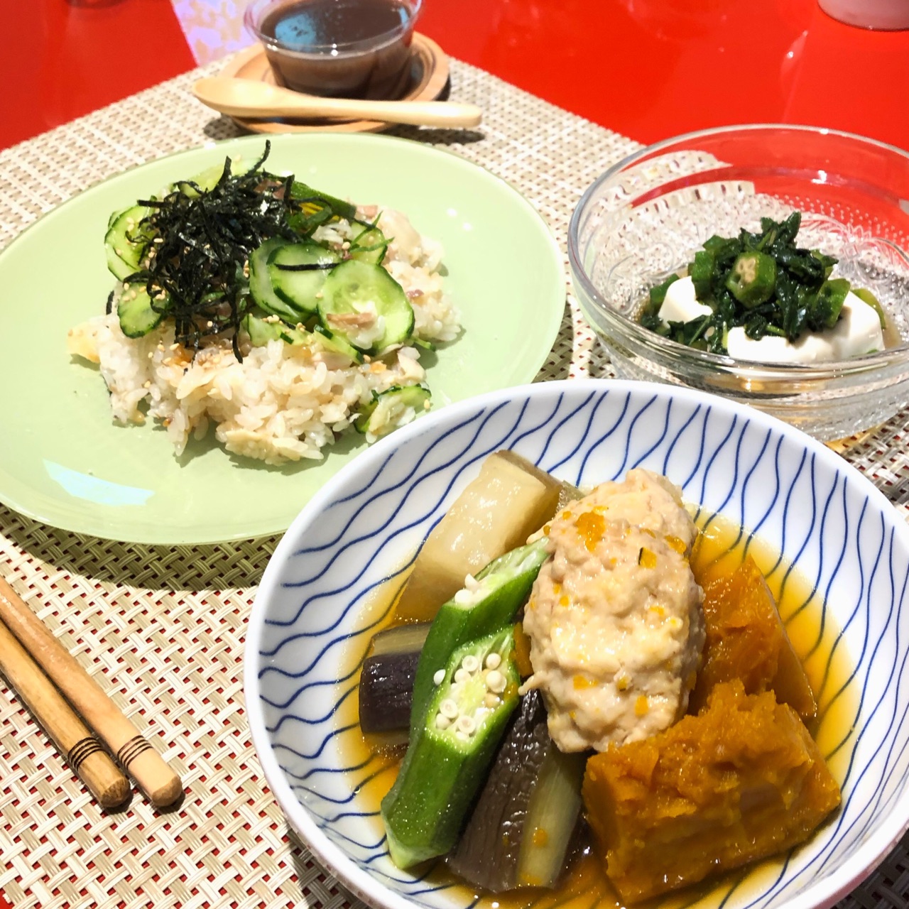 ・圧力鍋で夏野菜とふわふわ鶏団子の煮物