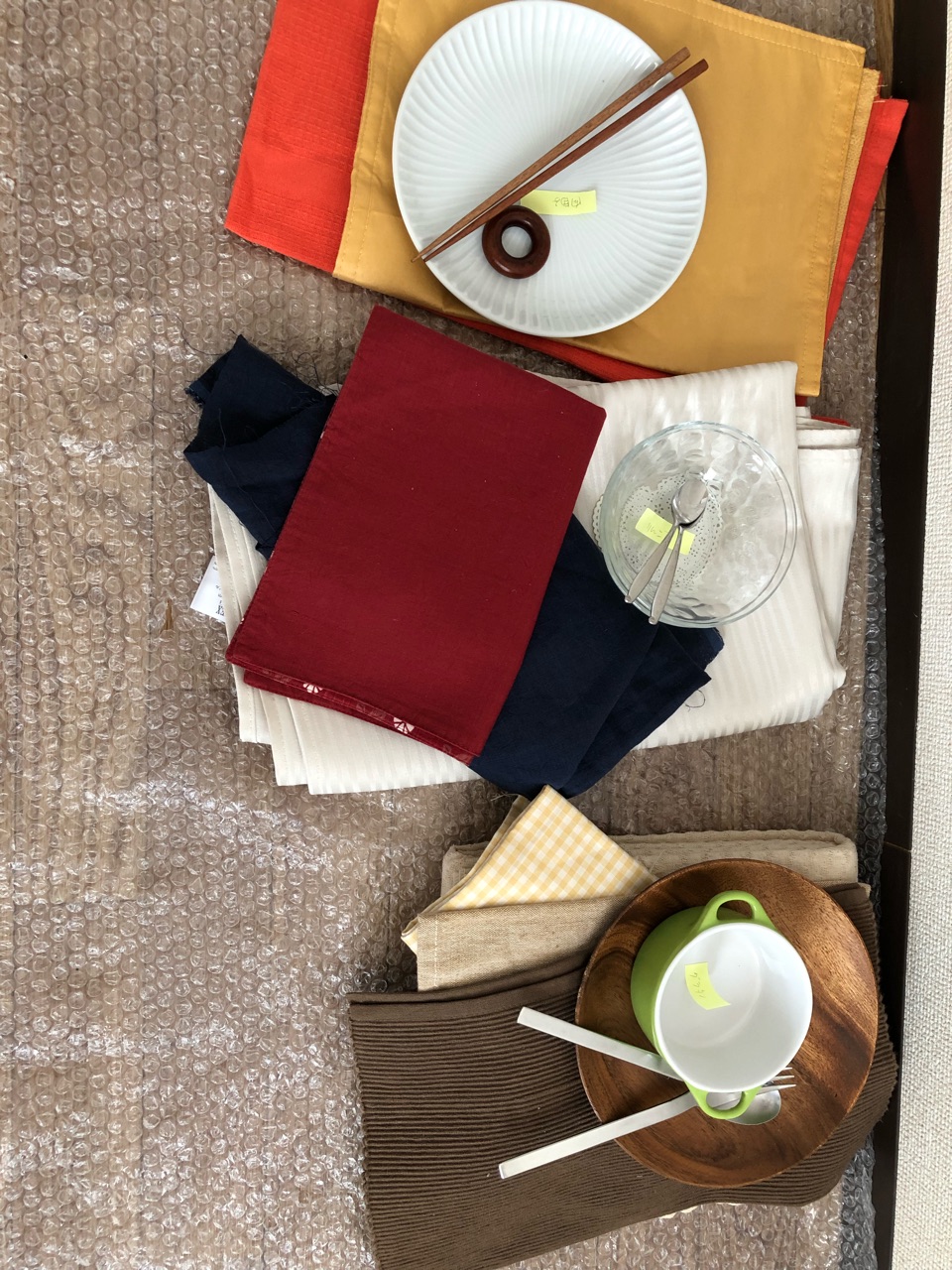 今日作る料理でつかう、食器や下地の布など。