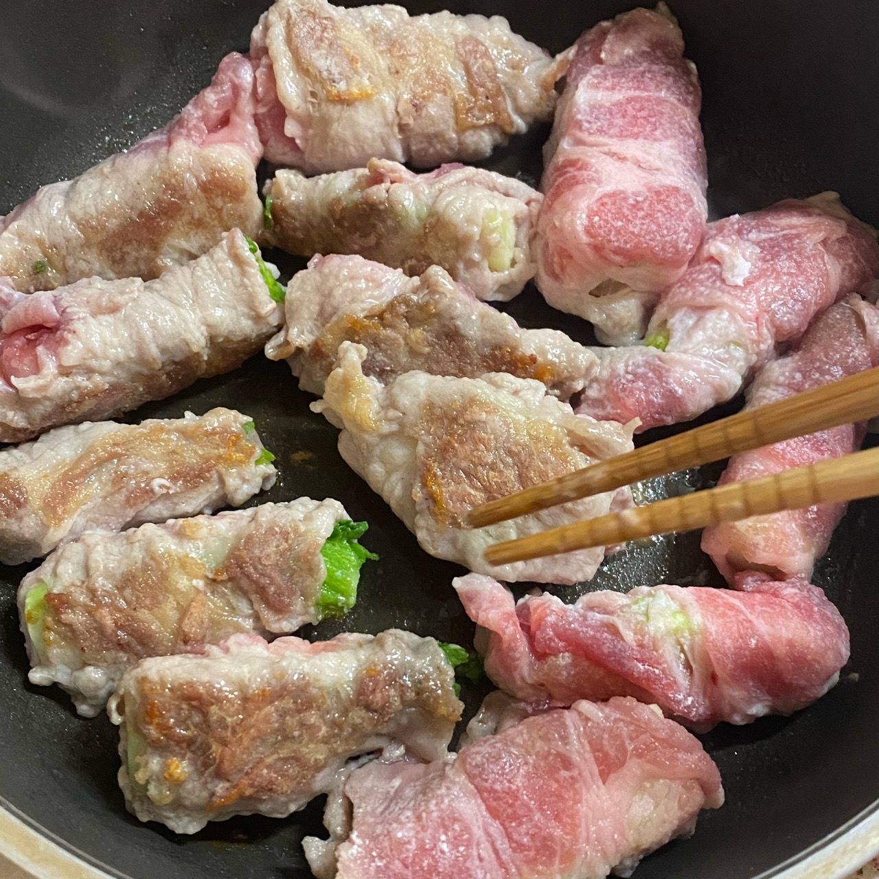 4)フライパンに油を熱し、(3)の肉巻きを並べて焼き付ける。