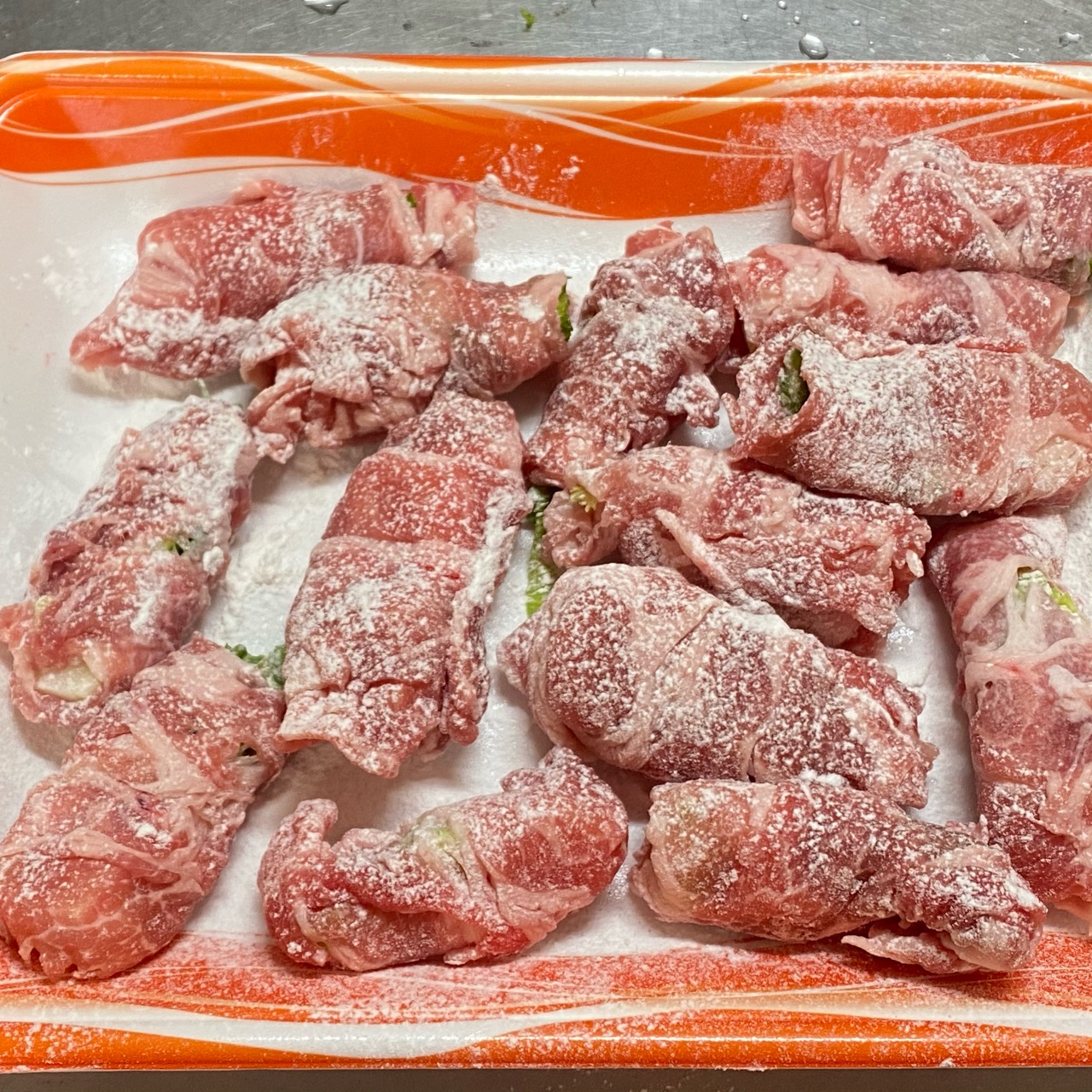 2)豚肉はかるく塩こしょうして広げ、蕾菜を芯にしてクルクルと巻く。