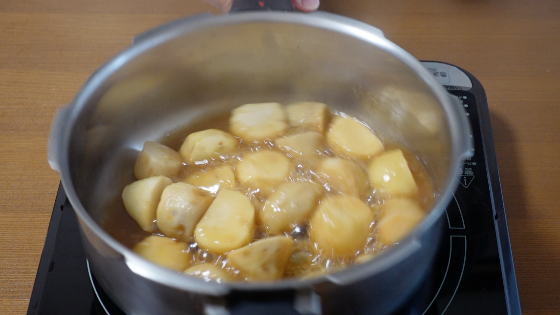 6)切った里芋を圧力鍋に入れ、水(200mL)、