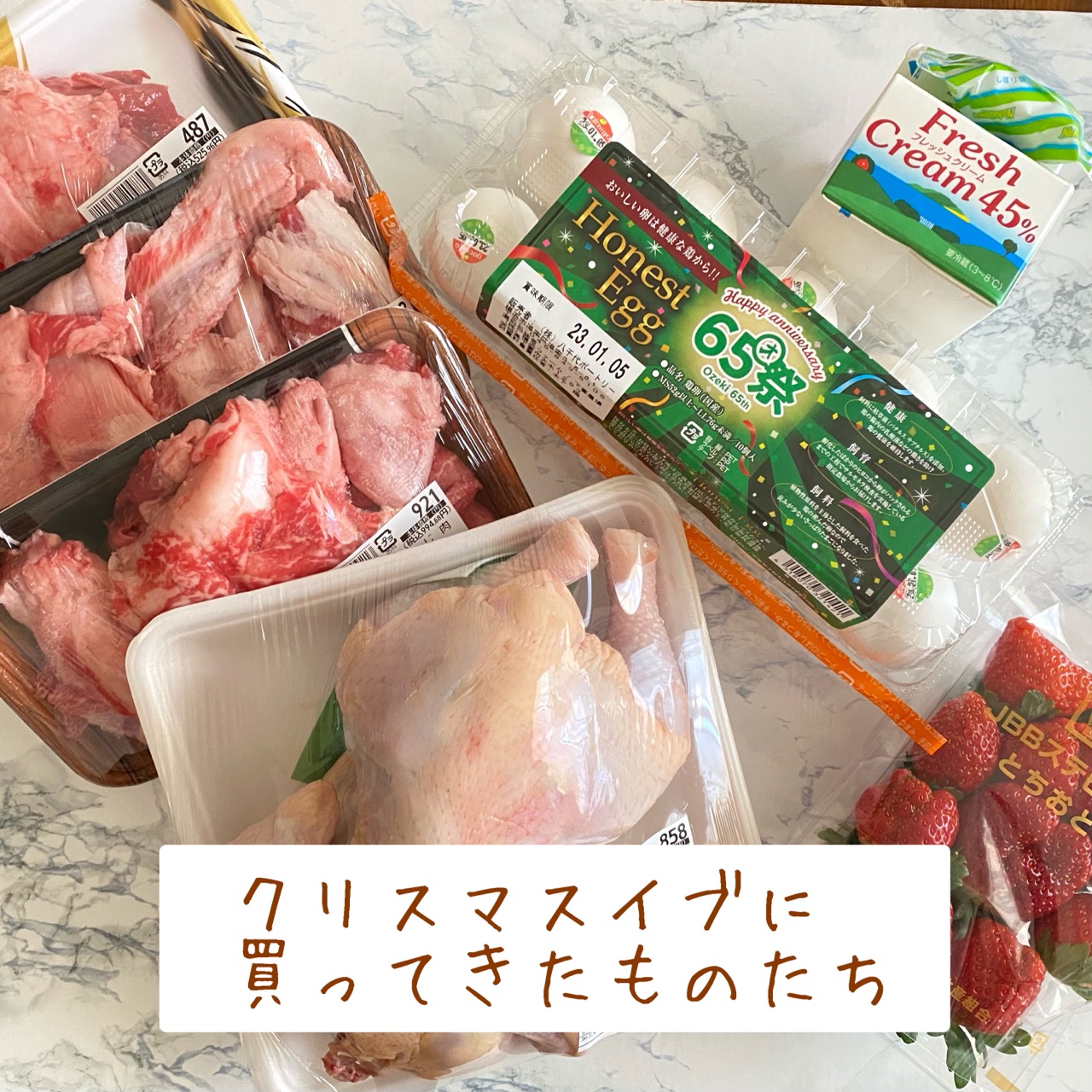 こちら、クリスマスイブに購入した食品たち。