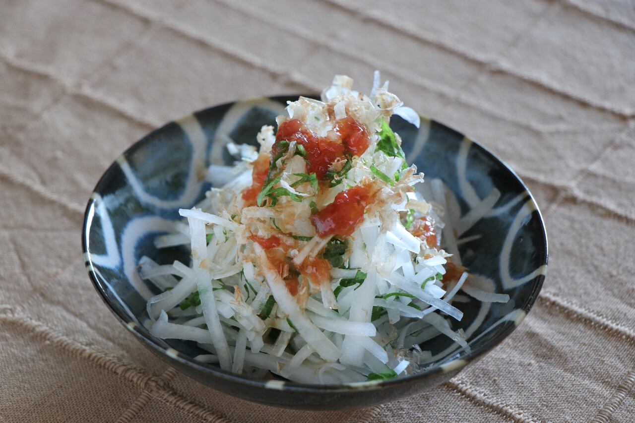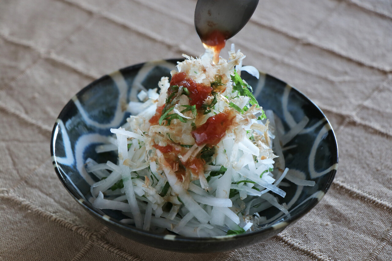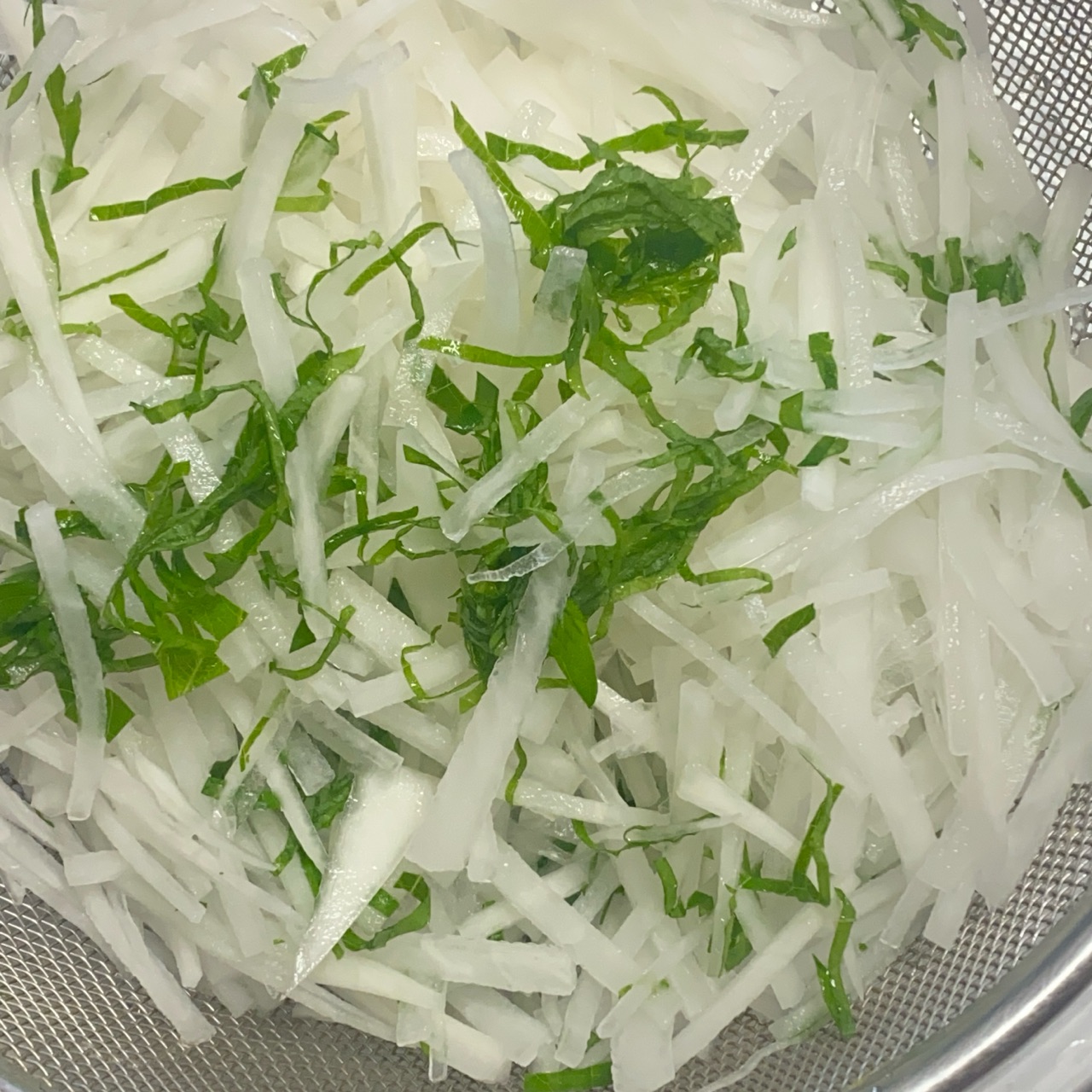 千切りの大根と青じそを、水に晒した状態で軽く混ぜると、