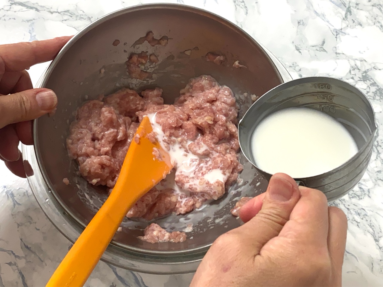 2. ひき肉を冷やした状態で酒を混ぜ、牛乳を5回に分けて少しずつ加え混ぜる。