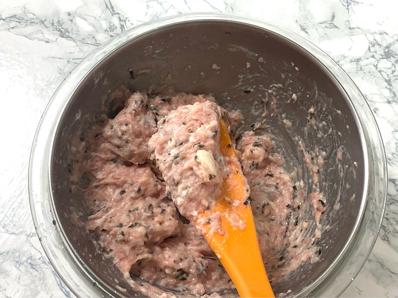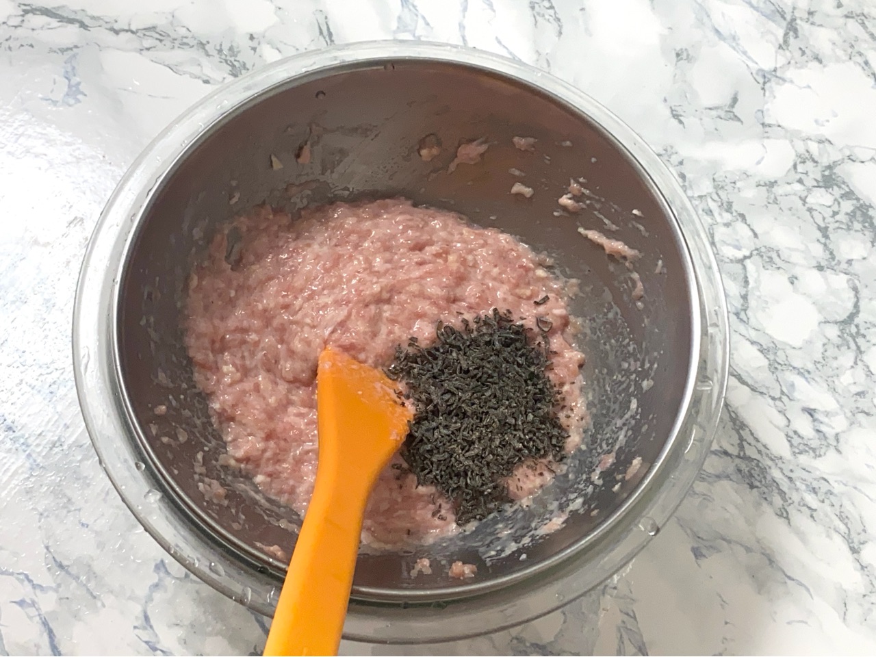 1. ボールにひき肉を入れ、氷水にあてておく